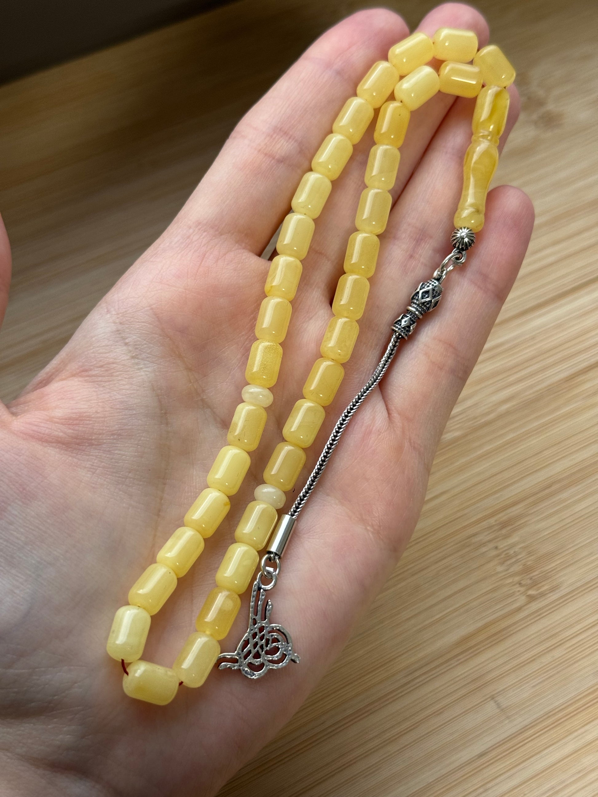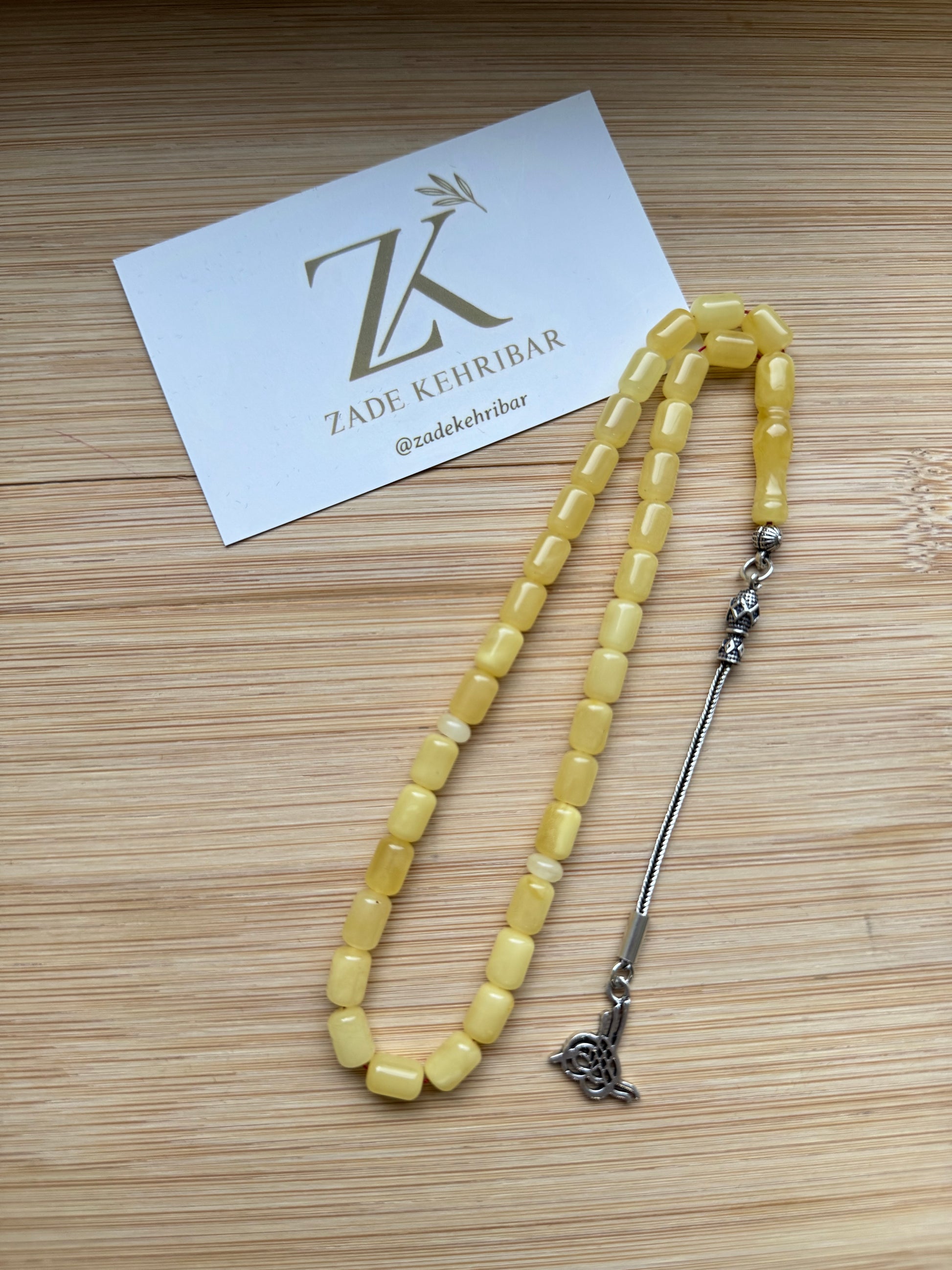 Kaliningrad Damla Kehribar Taspih - Kapsül Kesim - Mat beyaz - 6x9mm - 925 Ayar Gümüş Püskül - 8,93 gram (püskülsüz ağırlık).