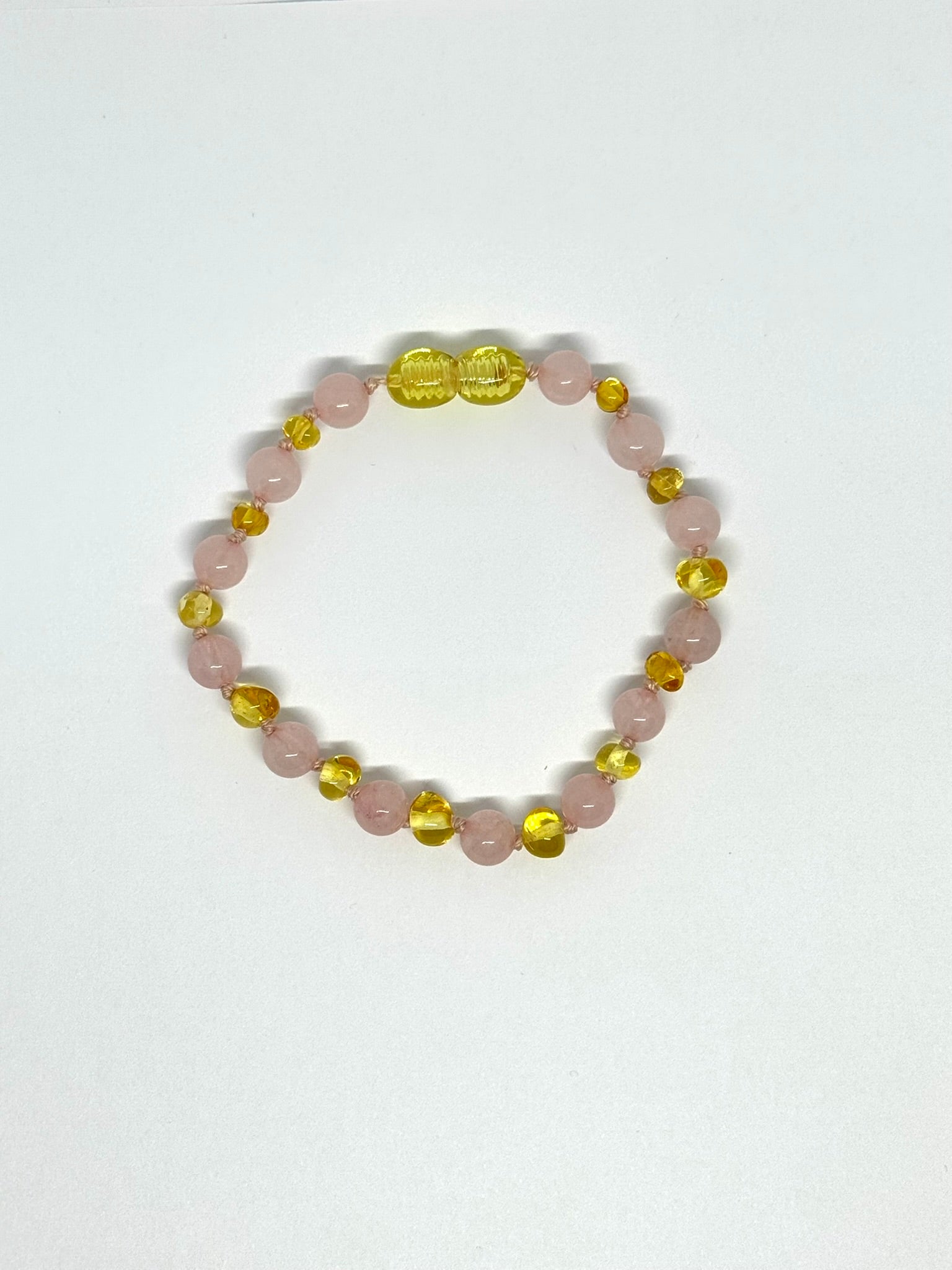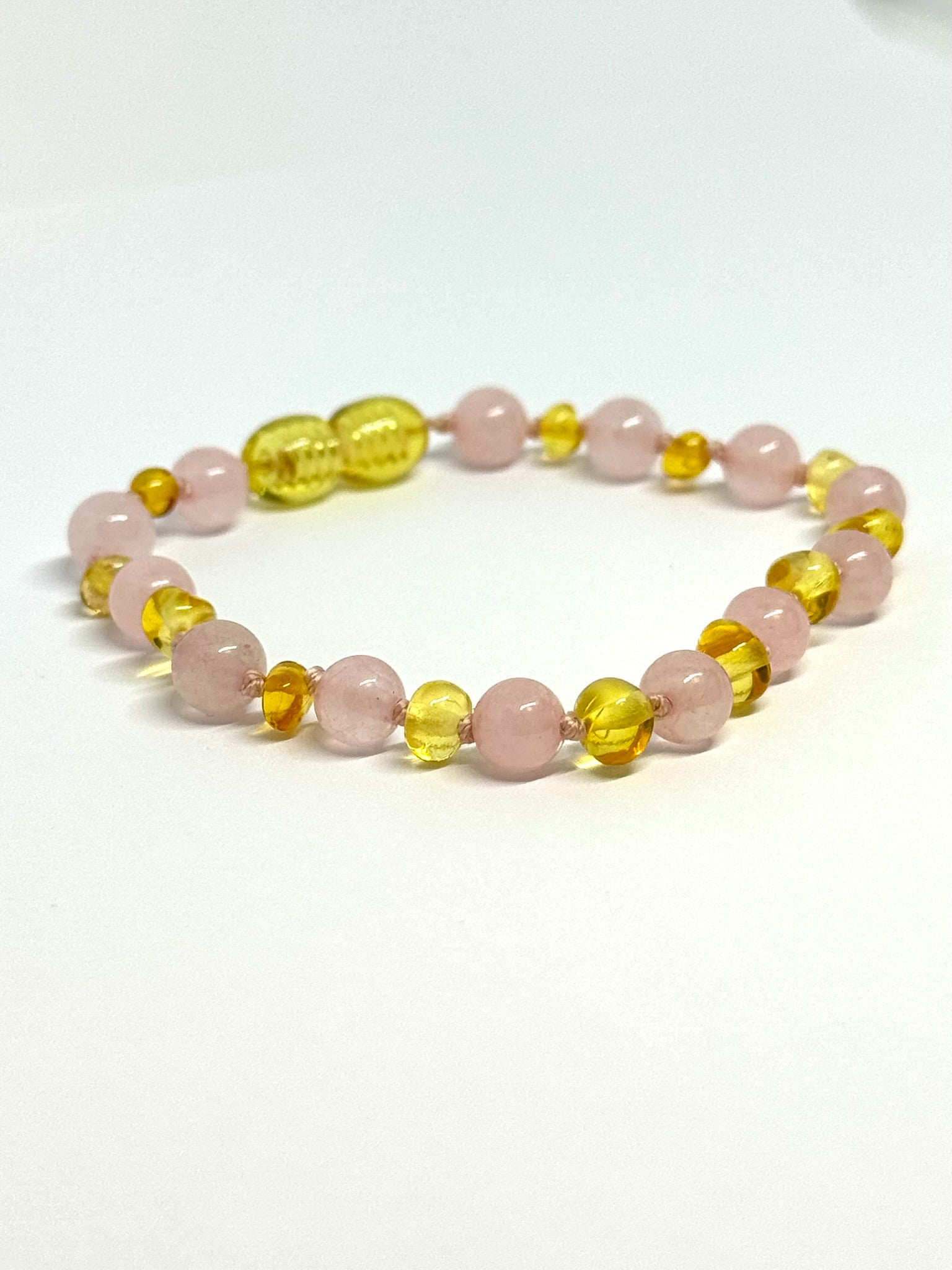 Armband voor volwassenen, gemaakt van natuurlijke Baltische barnsteen en Rozenkwarts.