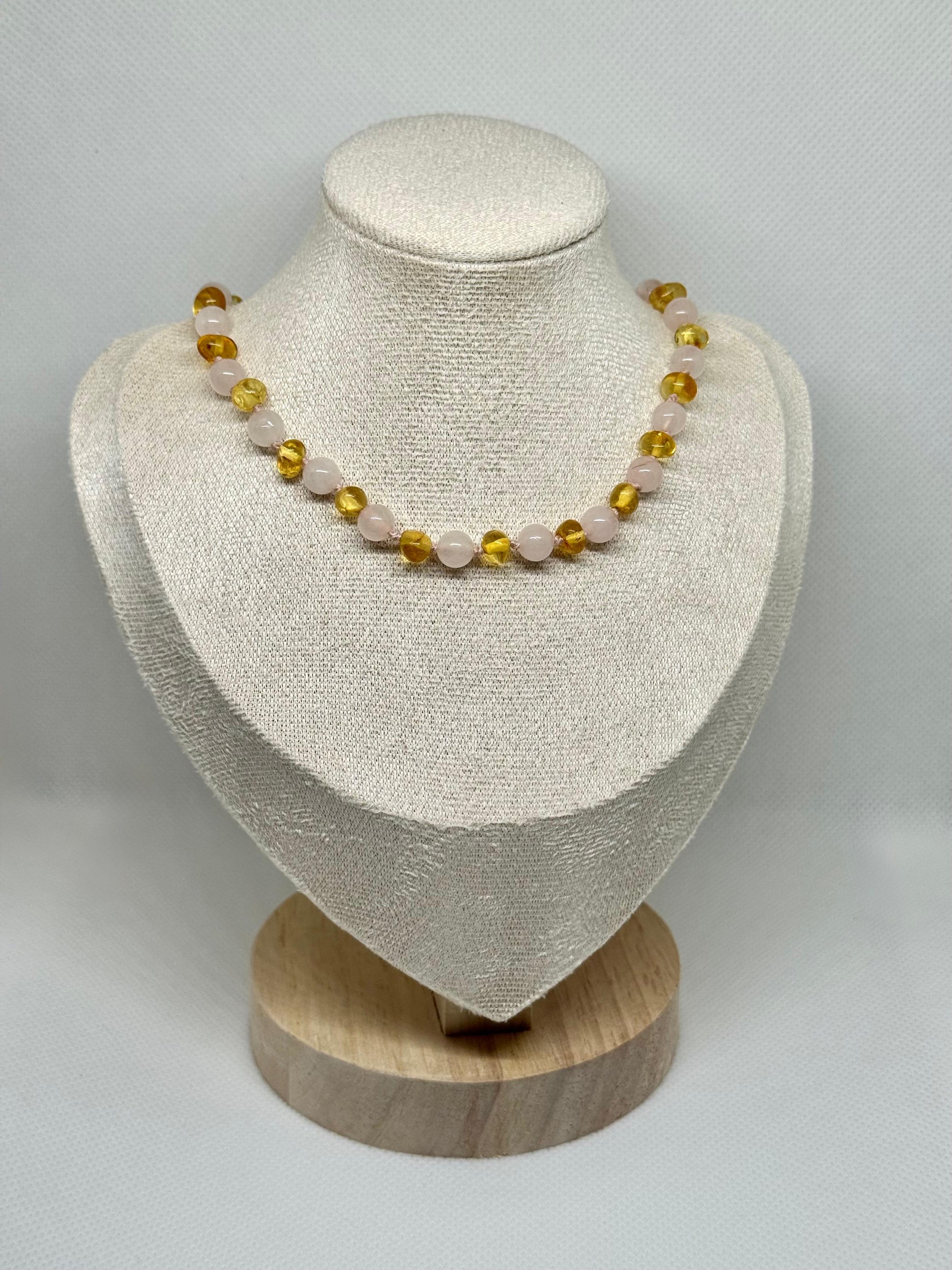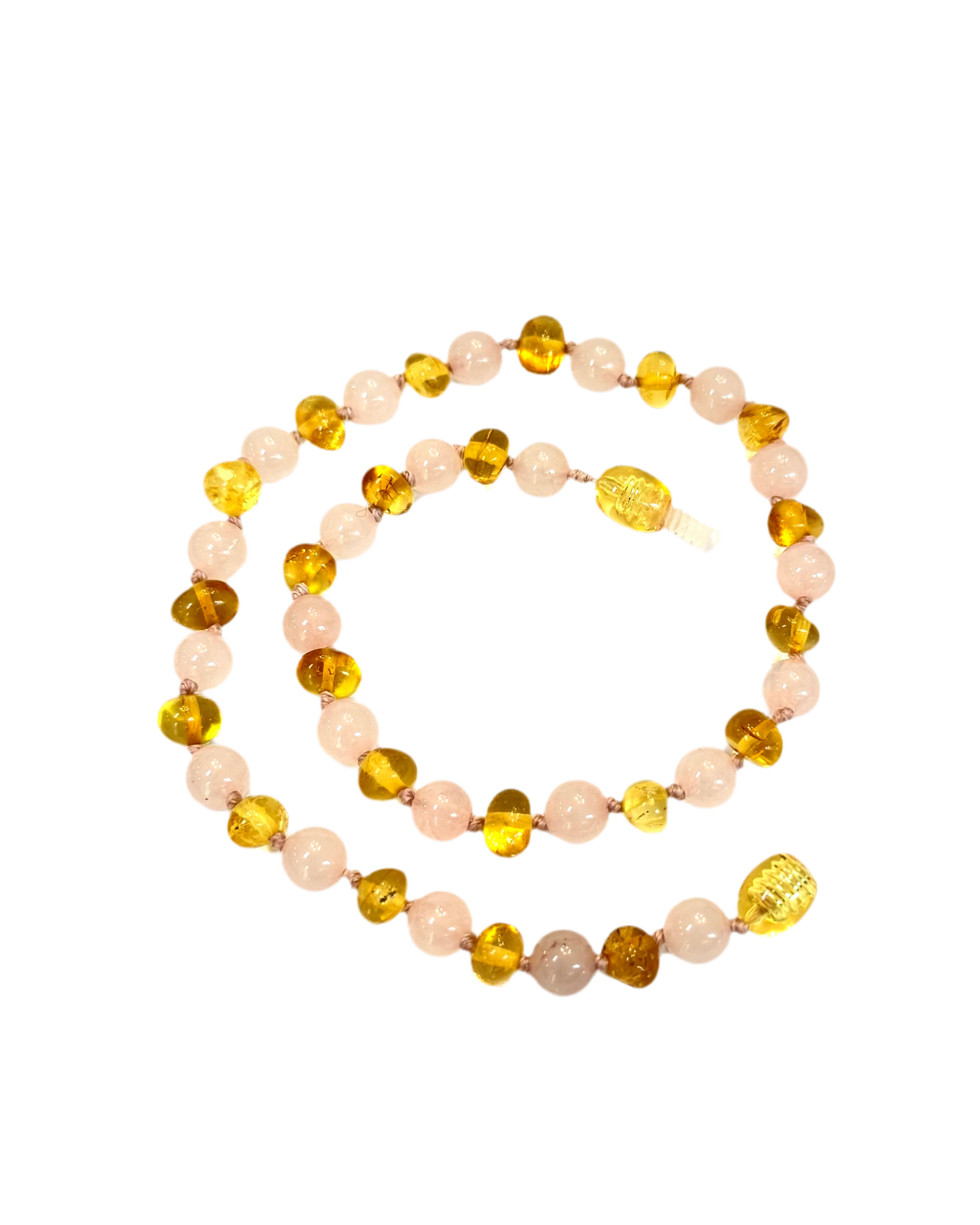 Ketting voor baby's, gemaakt van natuurlijke Baltische barnsteen en Rozenkwarts.