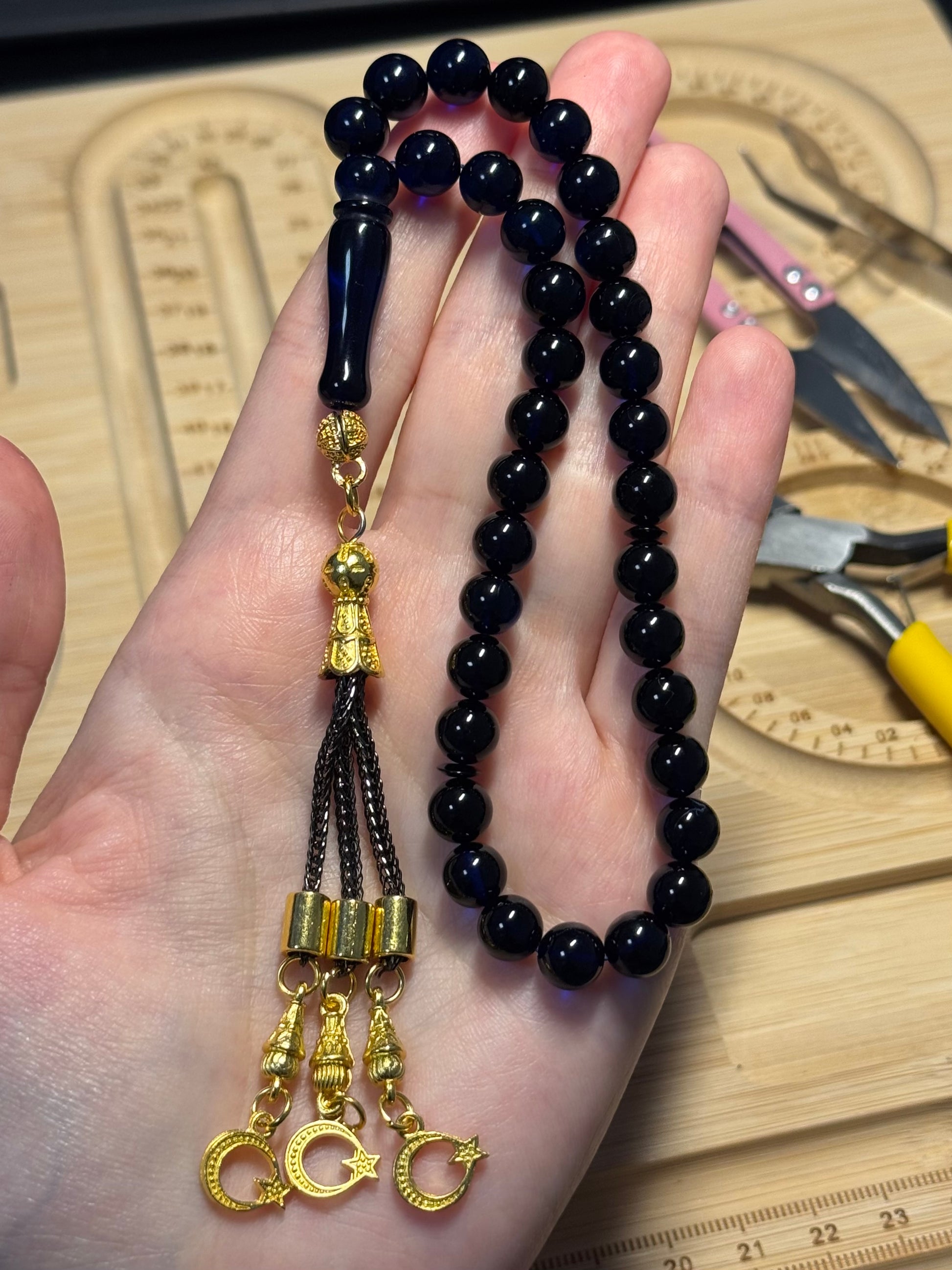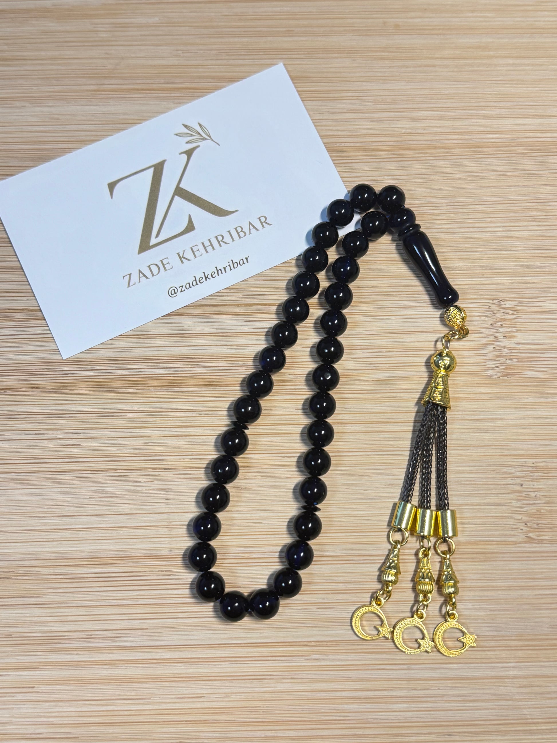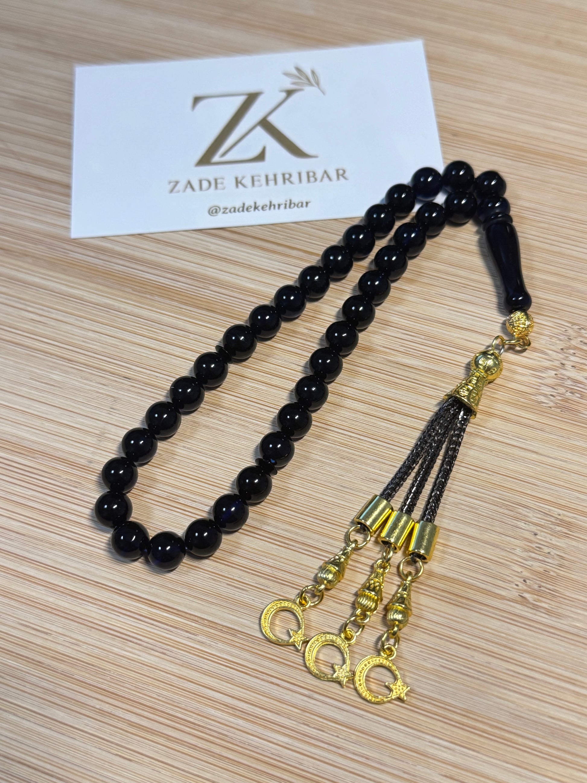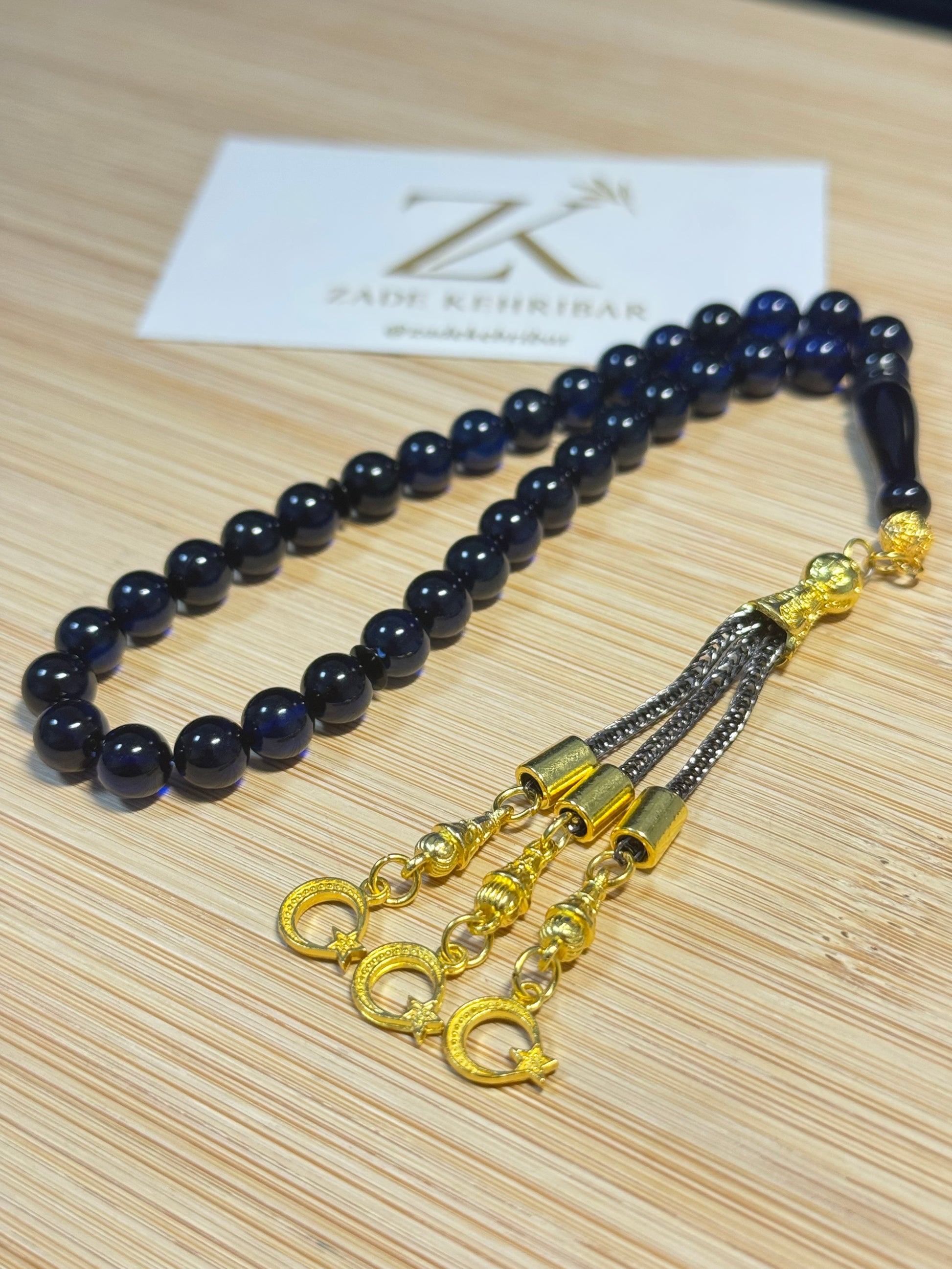 Karayip Damla Kehribar Tesbih - Metal Püskül - Küre Kesim - Mavi - 7,8 mm - 9,10 gram